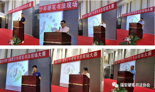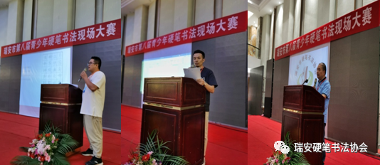 大赛现场评审会开幕仪式由王章洲副主席主持,1、孙海常务副主席致欢迎词;2、黄云宇监事长宣布监委会有关细则;3、许乙园常务副主席兼秘书长宣布第八届瑞安市青少年硬笔书法现场大赛有关说明4、李岳焕常务副主席兼党支部书记宣布第八届瑞安市硬笔书法现场大赛评审规则(3分钟);5、卢小丹主席团成员代表评委会宣誓誓词;6、请陈国权主席致辞并宣布现场大赛开始评审。