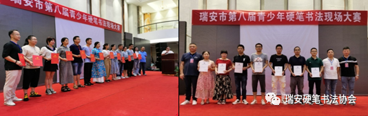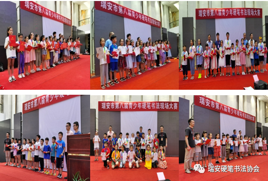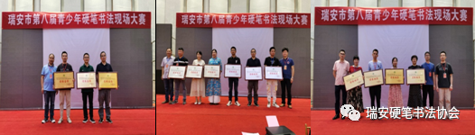 现场评出组织团体金奖3家,瑞安市绘博书法培训有限公司、瑞安市墨林书法培训有限公司、瑞安市墨田书法教育有限公司。银奖6家,瑞安市集雅轩书法培训有限公司、瑞安市临池书法培训有限公司、瑞安市墨海书法培训有限公司、瑞安市卢艺书法培训有限公司、瑞安市艺海美术书法培训中心、瑞安市忠艺文化交流有限公司。铜奖8家,瑞安市墨轩书法培训有限公司、北京华栋练字塘下校区、瑞安市起点书画培训有限公司、瑞安市千玺汉字馆、瑞安市墨艺书法培训有限公司、瑞安市芒果画室、瑞安市解放路小学、南方秀木书法工作室。